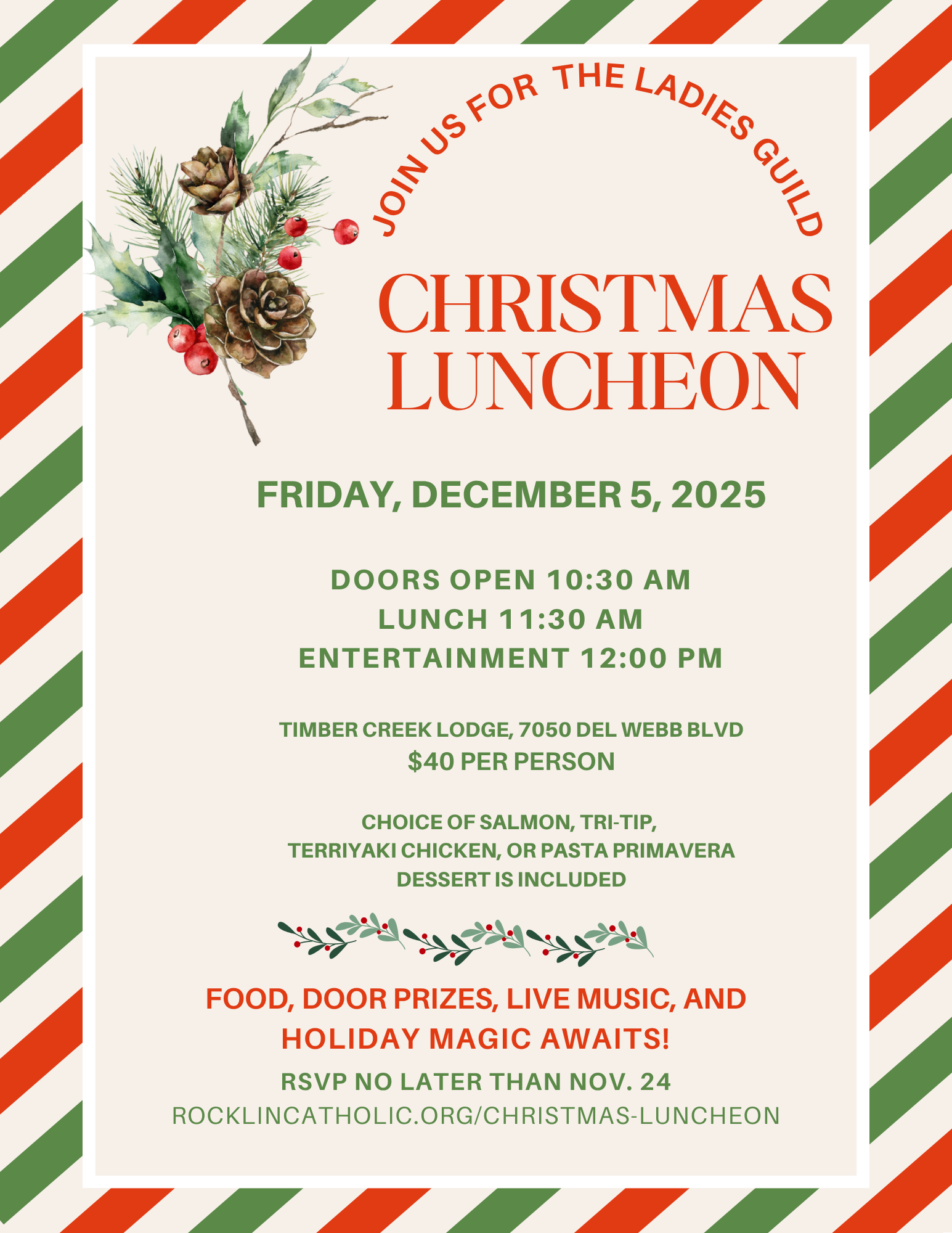 The Christmas Luncheon is an annual event sponsored by the Ladies’ Guild. It is that time of year to bring the ladies of our parish together, along with their significant others, to enjoy the holiday season.
